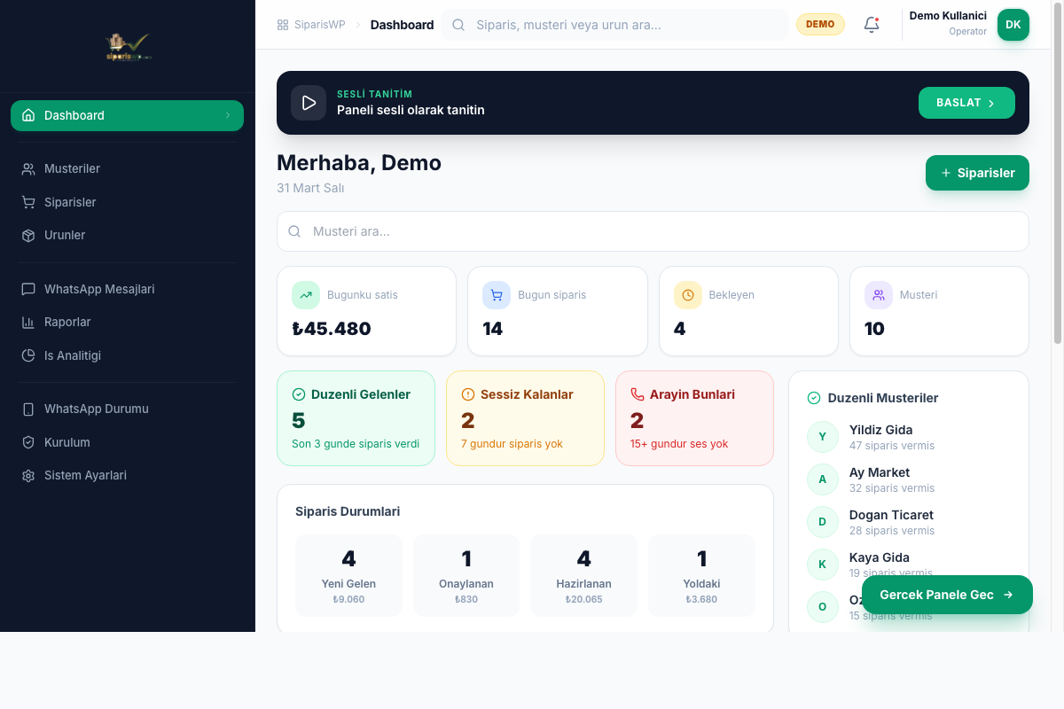 Müşteriniz WhatsApp'tan yazar, yapay zeka siparişi 2 saniyede tanır, panelinize düşer. Excel'e, kağıda, ses kaydına son.